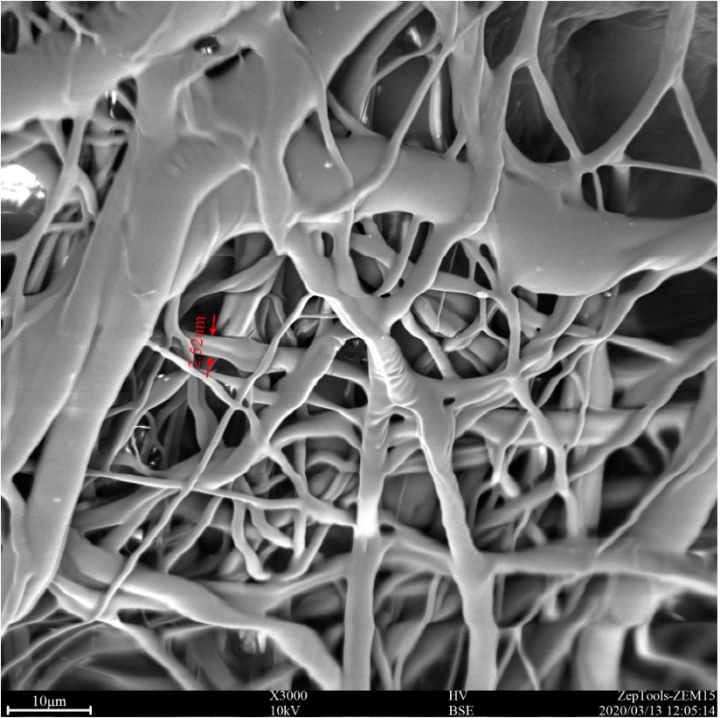 圖3 醫(yī)用外科口罩2中間過濾層(熔噴布層)的掃描電鏡照片。可以看到該層密集排布著1 - 15 um的纖維結(jié)構(gòu)。